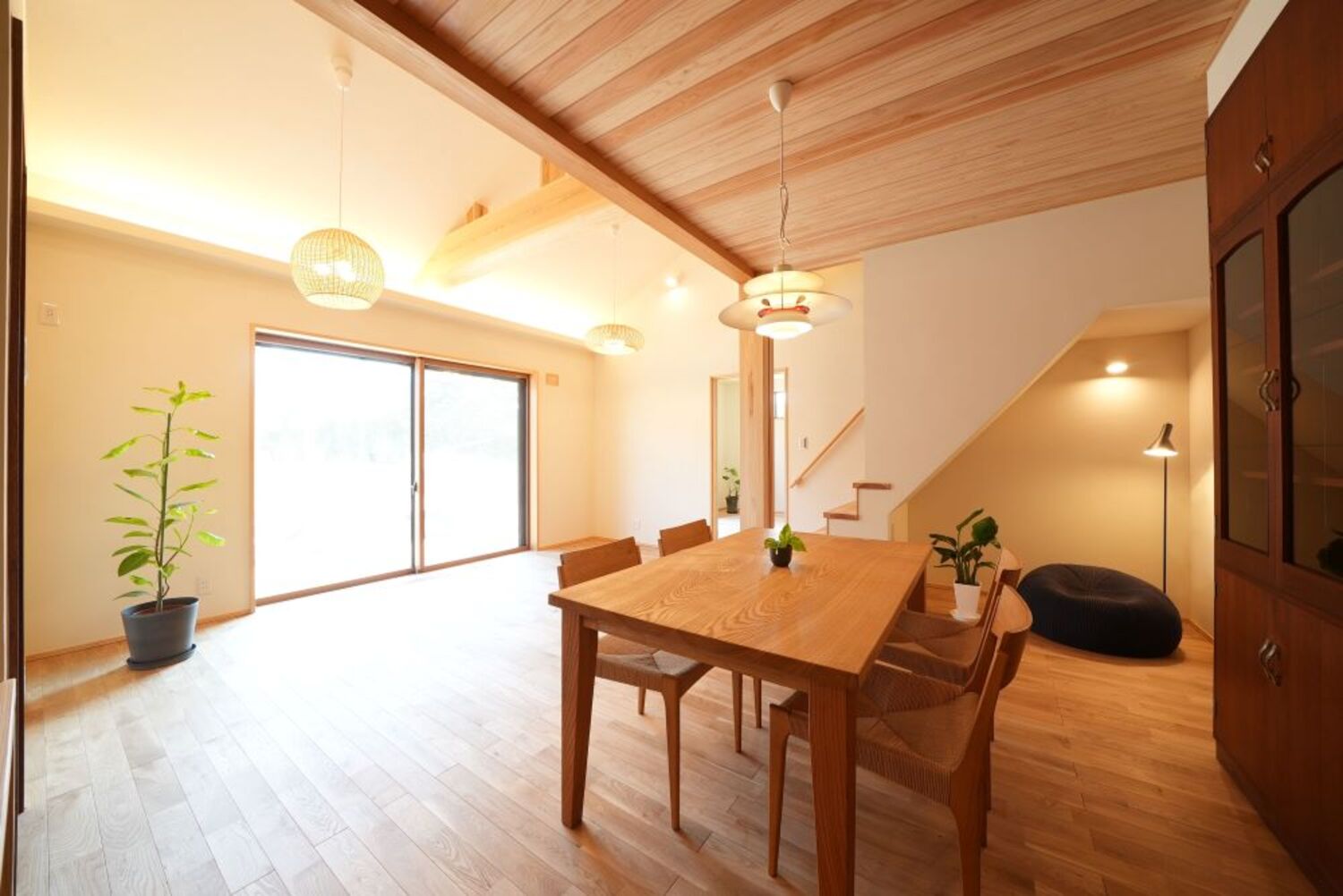掃き出し窓の先にはウッドデッキが続きます。また、梁を見せた勾配天井により、空間の奥行きやデザイン性を高めています。