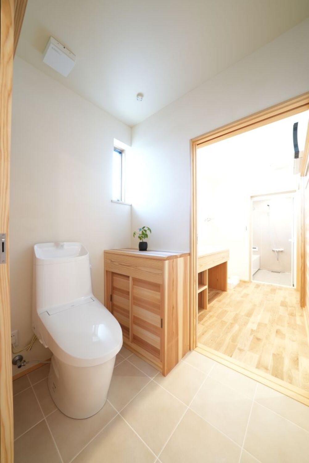 洗面室側、居室につながるホール側の2方向から出入りできるトイレです。