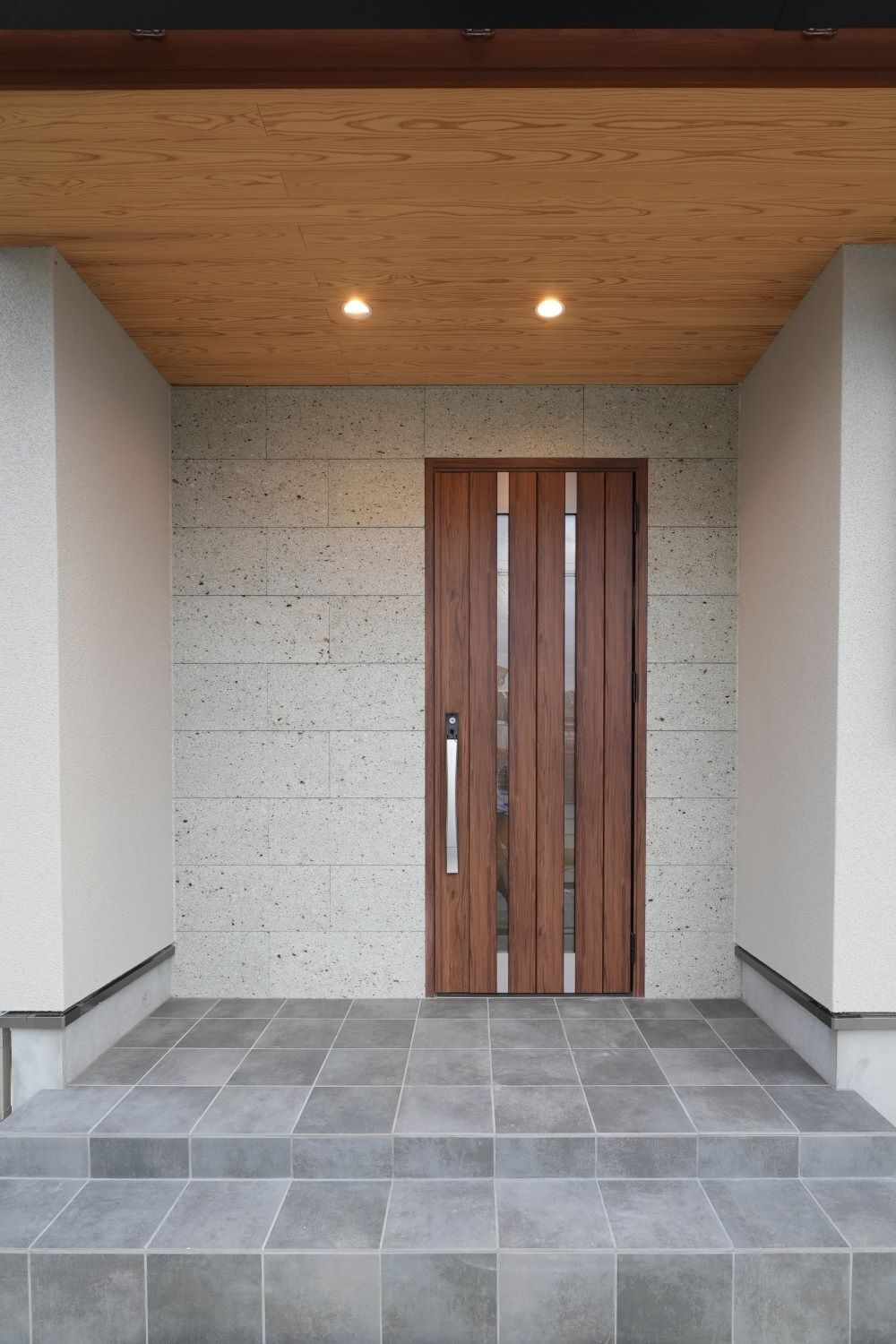 お施主様は弊社の和モダンデザインのモデルハウス「ミライヤ」を気に入ってくださり、同じなぐり加工の式台を採用されました。職人が丁寧に仕上げた凹凸のある木肌は、玄関に豊かな表情を与えています。