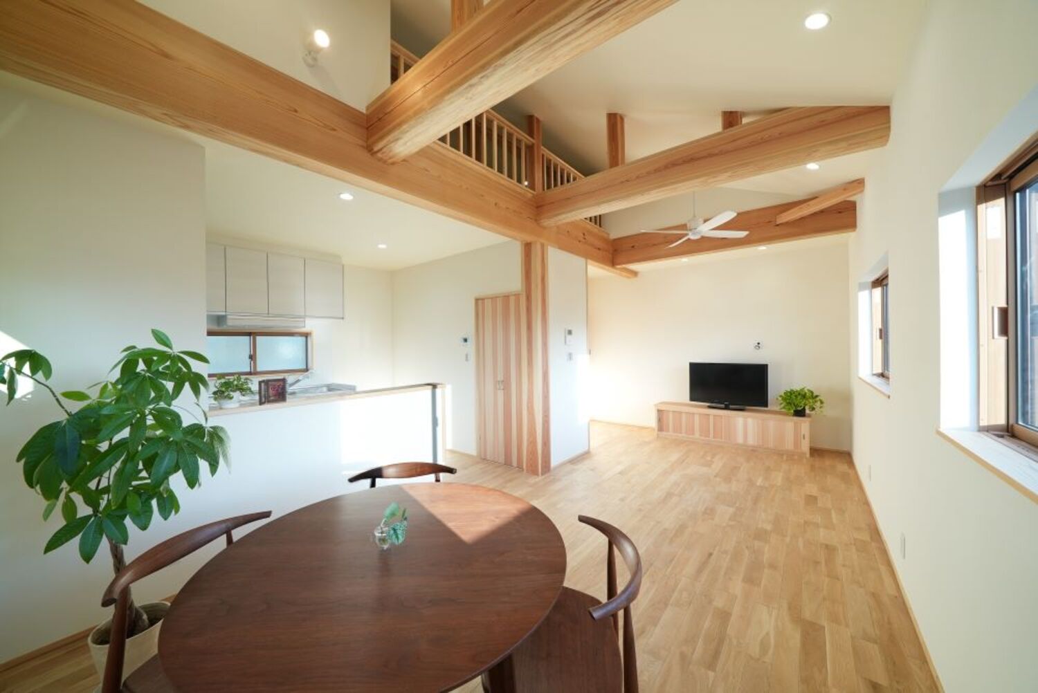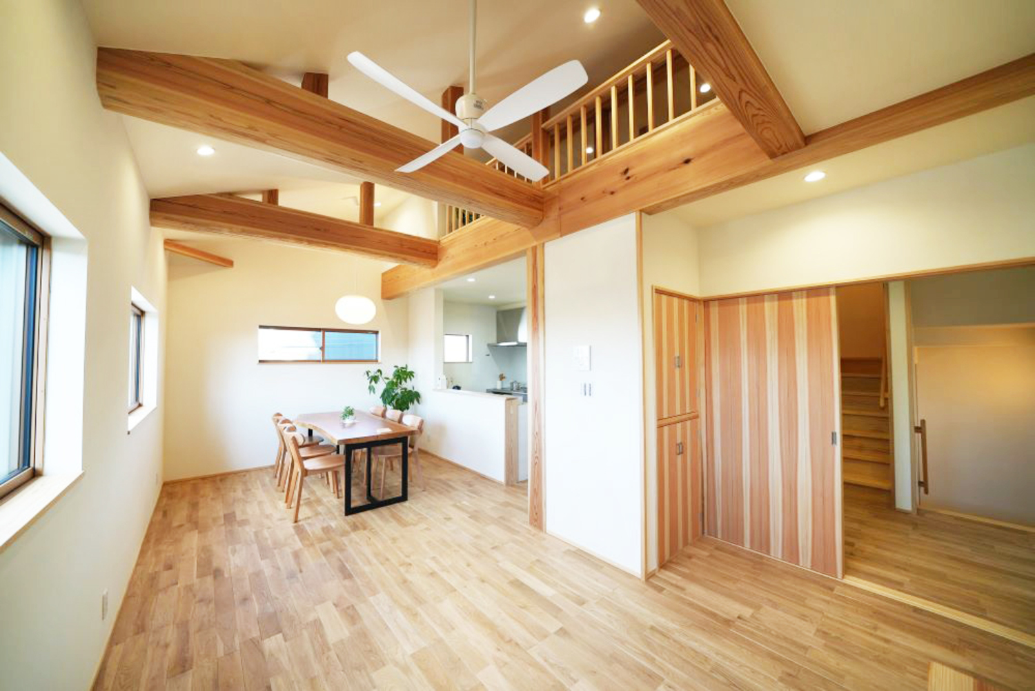 2階17.5帖のLDKは、勾配天井とロフトがひとつながりになった大空間です。樹齢100年以上の太鼓梁が存在感を放ち、実際の広さ以上の開放感があります。