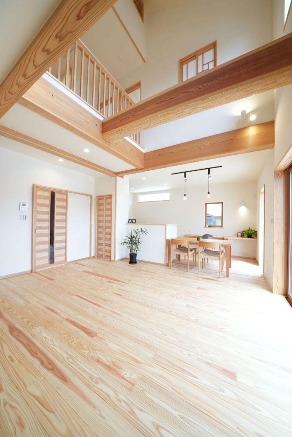 約19.8帖のLDKは、吹き抜けがもたらす縦の広がりと、木格子や大開口の掃き出し窓が織りなす横の抜け感によって、実際の広さ以上の開放感を感じられます。