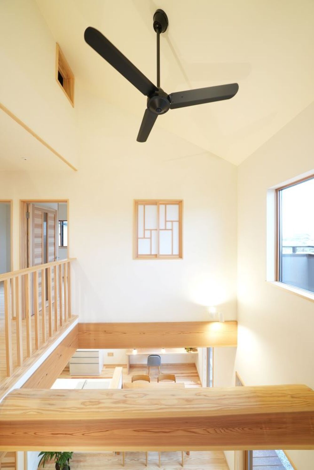 また、吹き抜けの天井に設置したシーリングファンと、弊社独自の「エコ通気システム」の相乗効果で、部屋全体に一定の気流を生み出し、室内の温度を均一に保ちます。