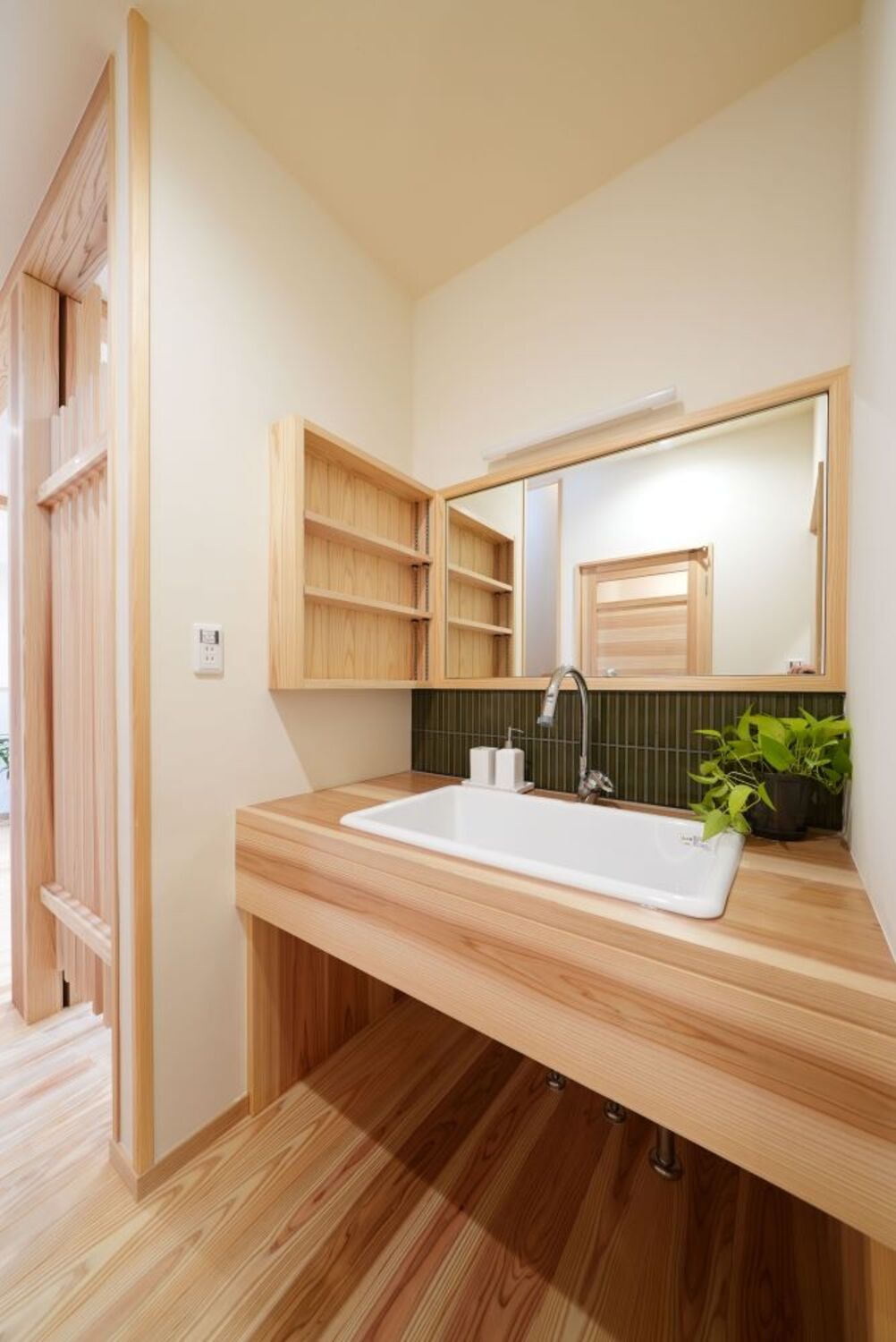 大工手作りの洗面化粧台です。鏡と造作棚をスッキリと収めています。