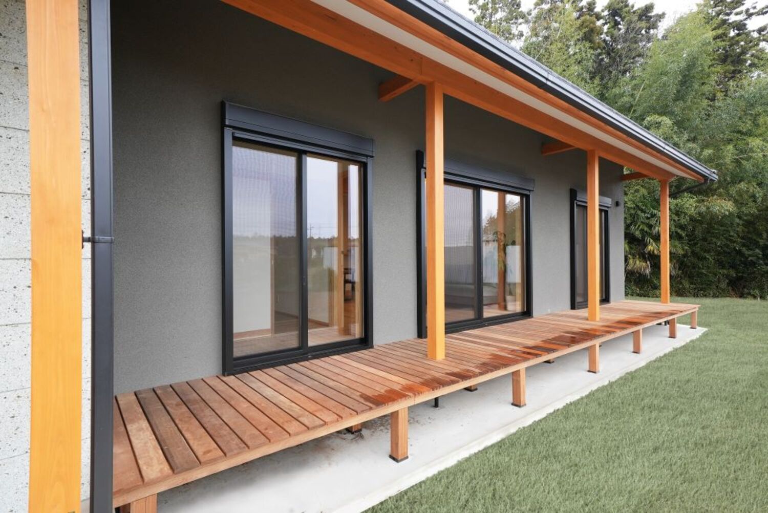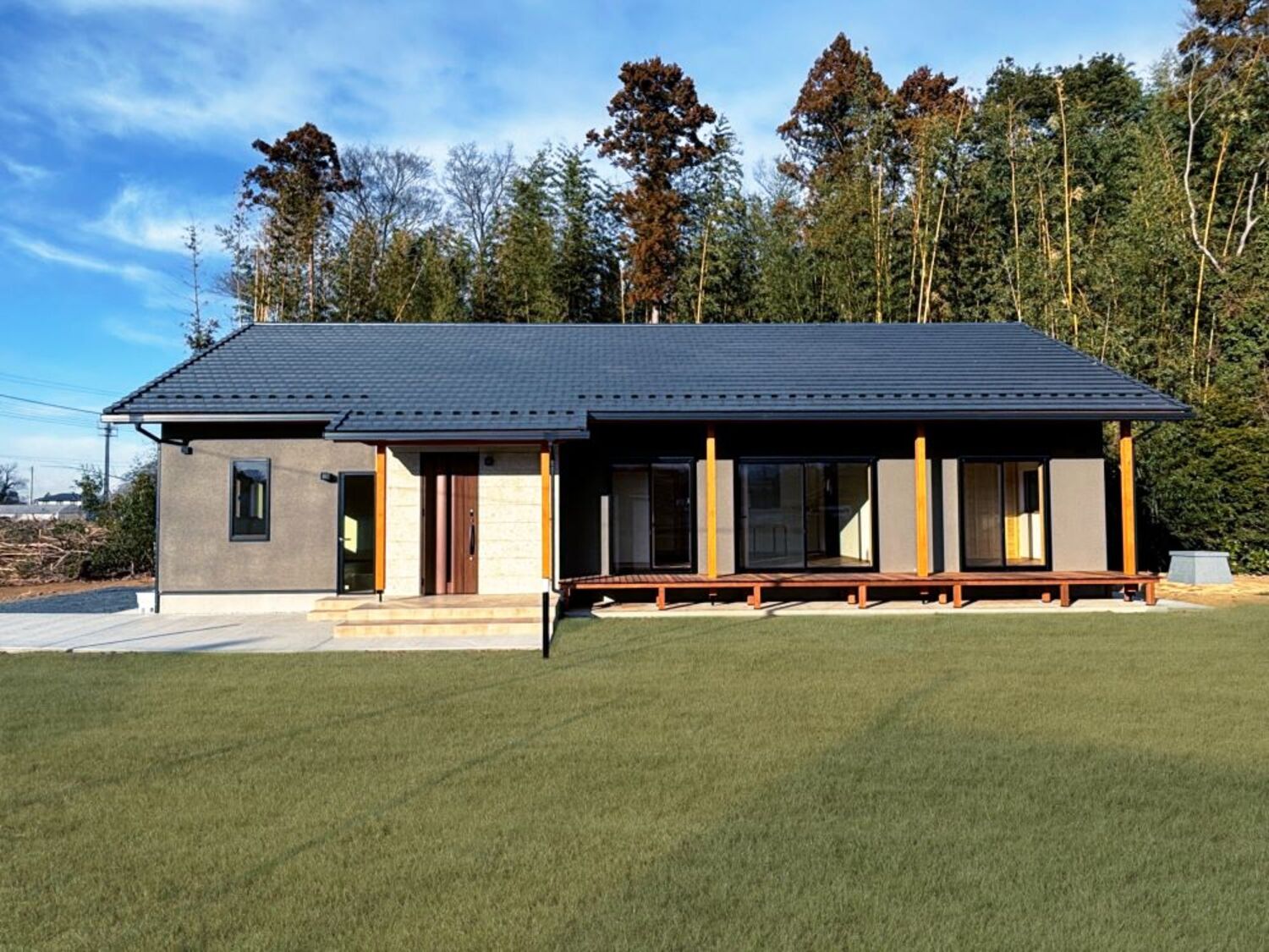 大屋根が安定感を強調し、落ち着きのある印象の平屋に仕上がりました。