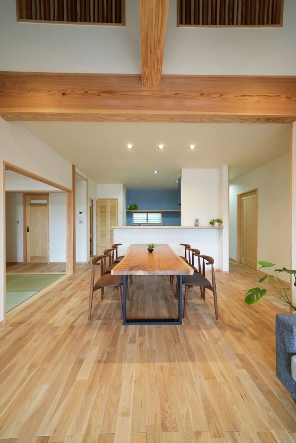 樹齢100年超の太鼓梁が十字に架かる、20.5帖の広々としたLDK。